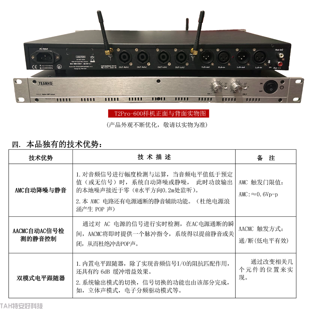 本品效率高,熱耗低,極低的本底噪聲,音質(zhì)可媲美于HIFI甲類功放。此外,系統(tǒng)還具備了自動電平壓限控制與降噪靜音功能,并通過檢測AC技術(shù),杜絕了設(shè)備開/關(guān)機的浪涌 POP 聲。